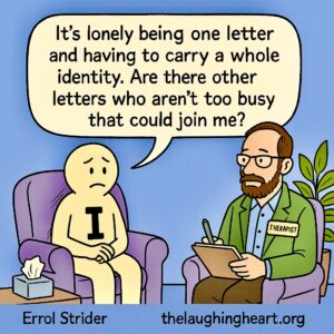 I: It’s lonely being just one letter and having to carry a whole identity November 22, 2025 By estrider Leave a Reply Cancel replyYour email address will not be published. Required fields are marked *Comment * Name * Email * Website Δ